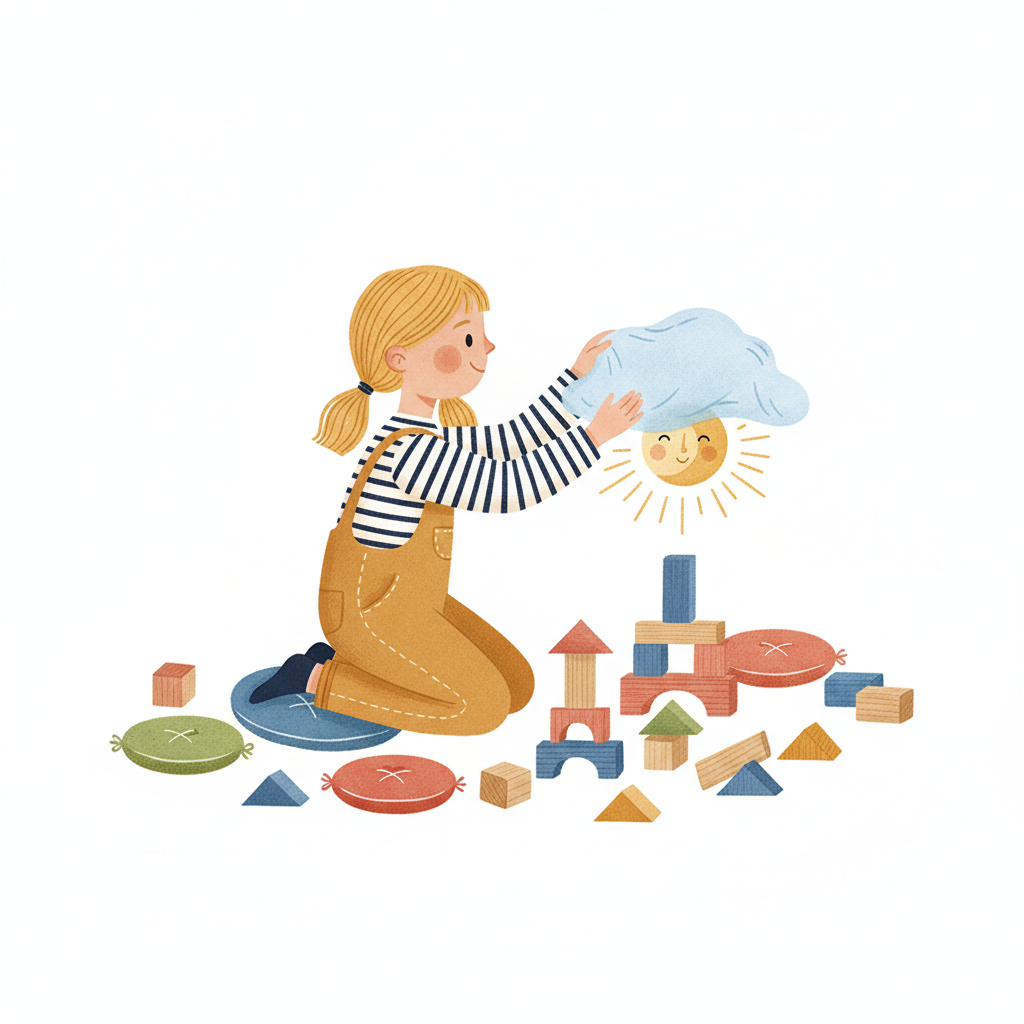 Mädchen spielt mit Holzklötzen und hält eine Wolke mit lächelnder Sonne.