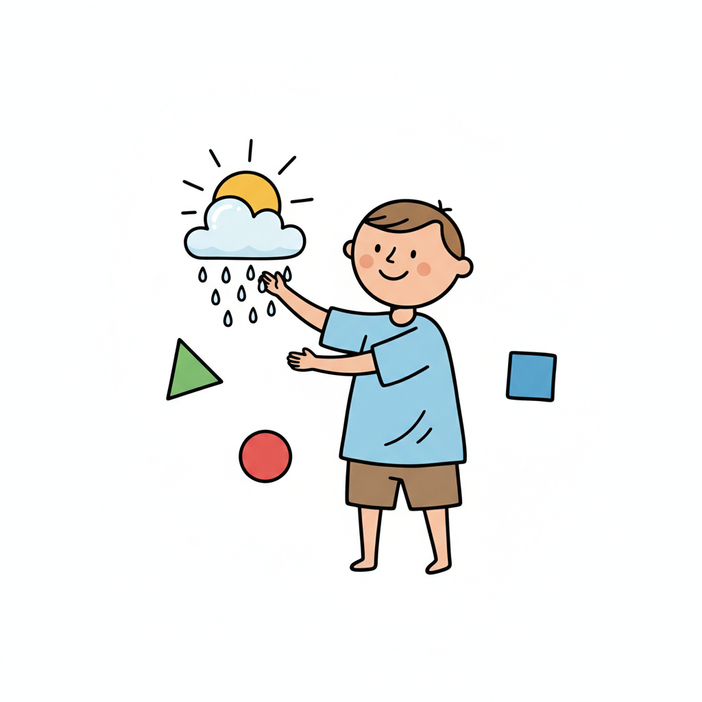 Junge spielt mit Sonne, Wolke, Regen und geometrischen Formen.