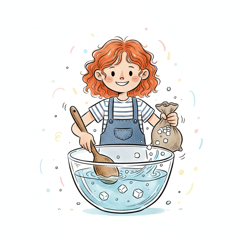 Ein lächelndes Mädchen mit roten Locken rührt Zuckerwürfel in einer Schüssel Wasser.