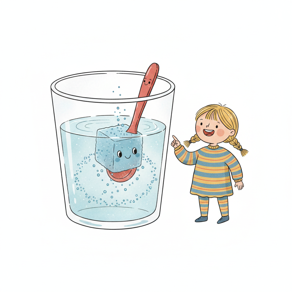 Mädchen beobachtet, wie ein lächelnder Zuckerwürfel in Wasser gelöst wird.