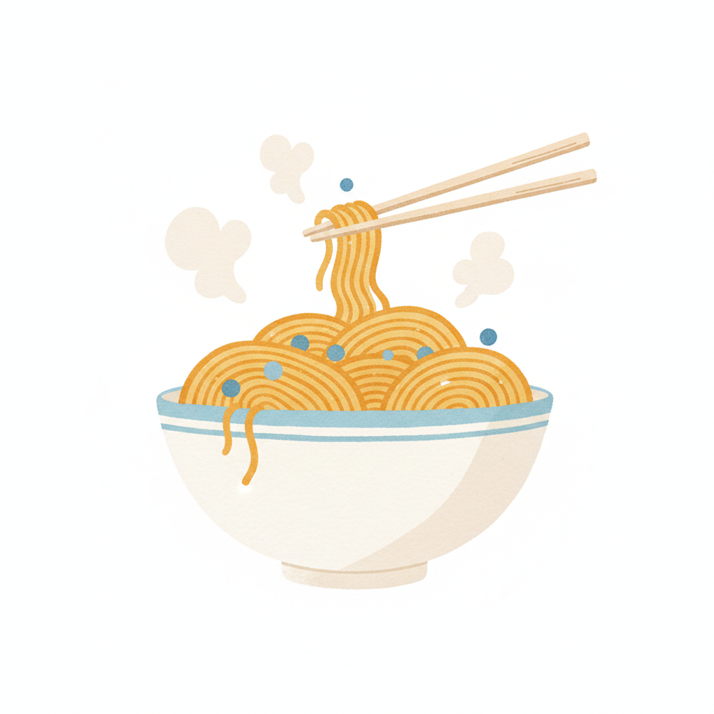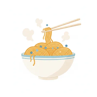 Illustration einer Schale dampfender Nudeln mit Essstäbchen, die Nudeln aufnehmen.