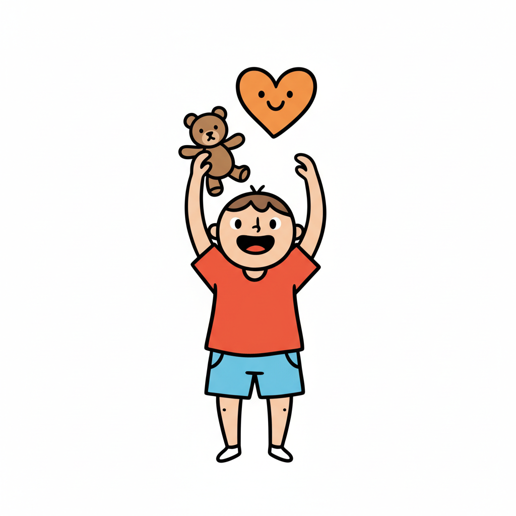 Glücklicher Cartoon-Junge hält Teddybär hoch, darüber ein lächelndes Herz. Symbolisiert Freude.
