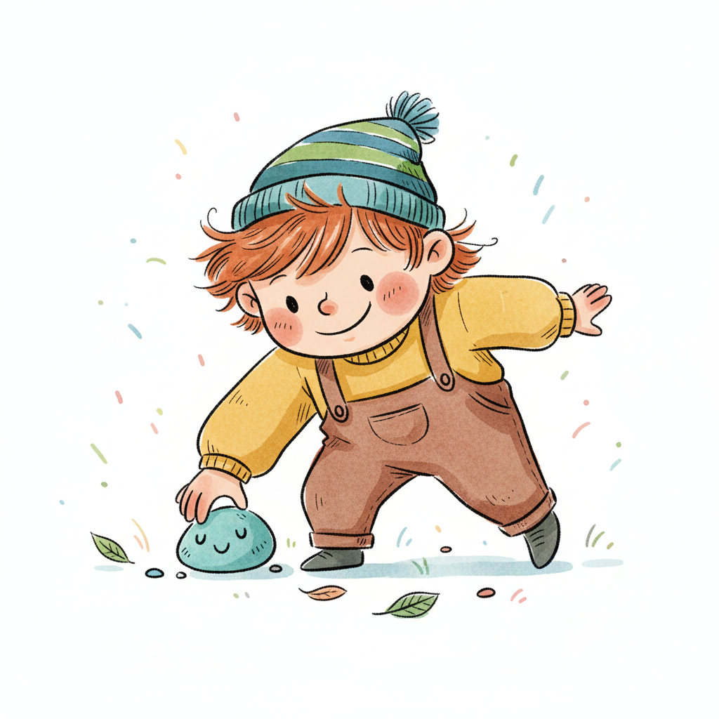 Niedliche, kindgerecht illustrierte Szene mit einem Kind oder einer Person als Hauptfigur, vor rein weißem Hintergrund, im frech-nordischen Aquarell-Skizzenstil. Klare, leicht wackelige Tuschekonturen, sichtbare Pinsel- und Strichtextur, dezente Schraffuren, weiche handgemalte Farbflächen in gedeckten Farben. Einfache, runde Formen. Keine harten Schatten, sondern sanfte, transparente Aquarellschichten. Leicht raue, handgezeichnete Linien statt glatter Vektorkanten. Subtile, vereinzelte Kritzelpunkte oder kleine Details im Hintergrund (wie Pünktchen oder feine Striche), aber keine echte Umgebung oder Landschaft. Die Figur ist mittig zentriert. Insgesamt charmant, humorvoll, warm und handgemacht wirkend. WICHTIG: Das Bild darf ABSOLUT KEINEN TEXT, KEINE BUCHSTABEN und KEINE ZAHLEN enthalten.