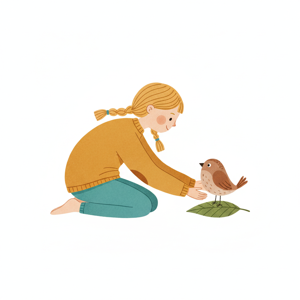 Illustration: Mädchen kniet vor einem Vogel auf einem Blatt, reicht ihm sanft die Hände.