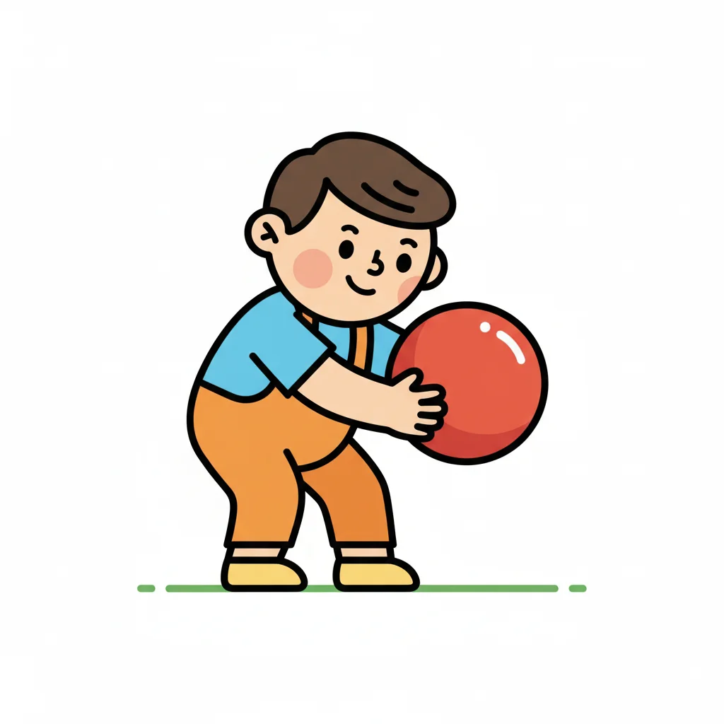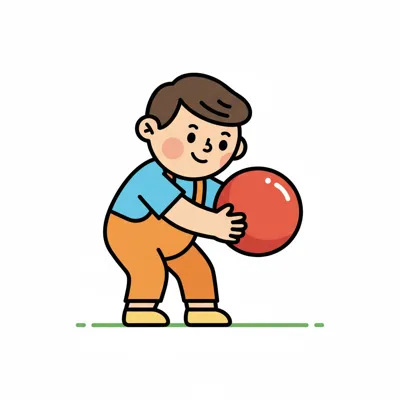 Ein lächelnder Cartoon-Junge in Latzhose hält einen roten Ball.