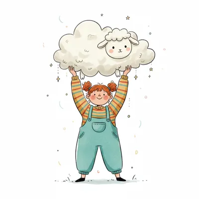 Niedliches Cartoon-Mädchen hält eine flauschige Wolke mit einem Schafskopf hoch.