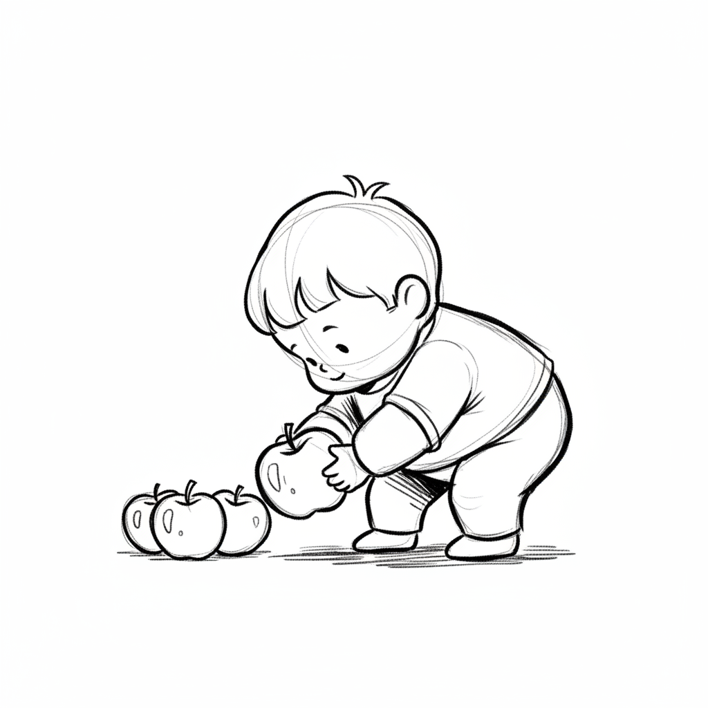 Niedliches Cartoon-Kind bückt sich und hebt einen Apfel auf, daneben liegen weitere Äpfel.