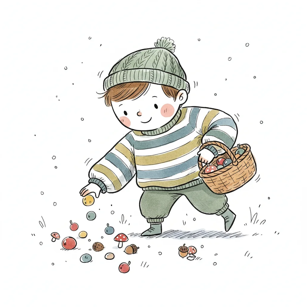 Fröhliche Figur sammelt Äpfel und Eicheln in einem Korb, Herbstaktivität.