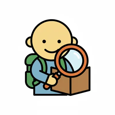 Lachende Figur mit Rucksack und Lupe untersucht ein Paket.