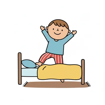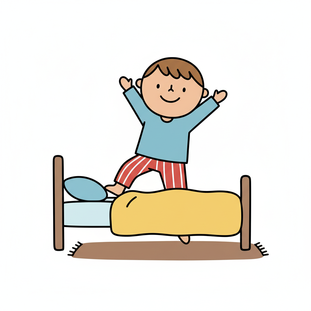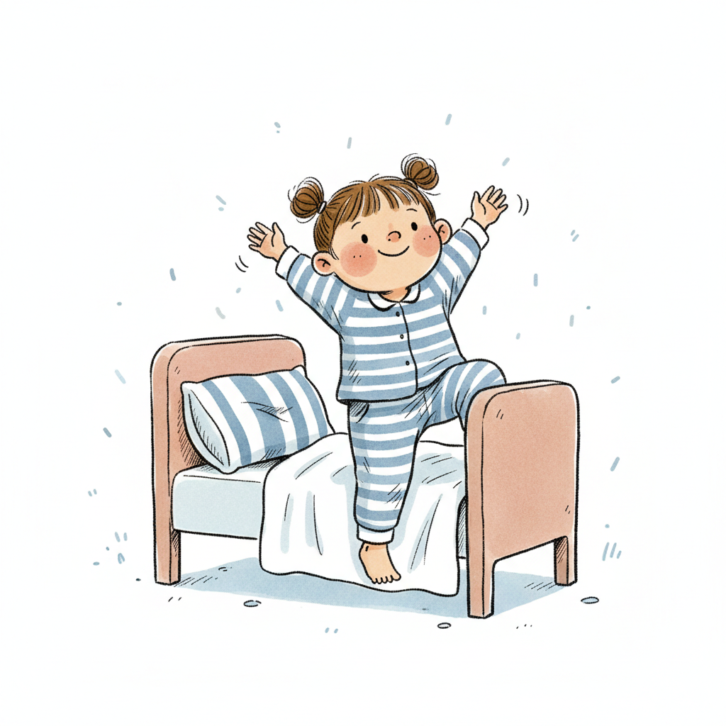 Ein Kind in Schlafanzug springt fröhlich aus dem Bett.