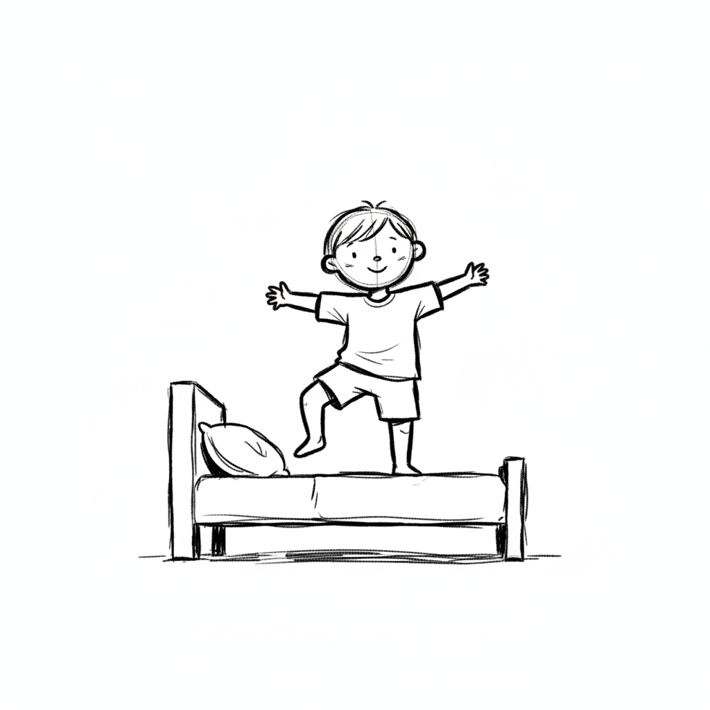 Ein Junge springt fröhlich auf einem Bett und hat die Arme ausgestreckt.