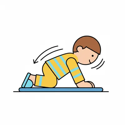 Ein Junge krabbelt auf einer Matte in einer blauen und gelben Kleidung.