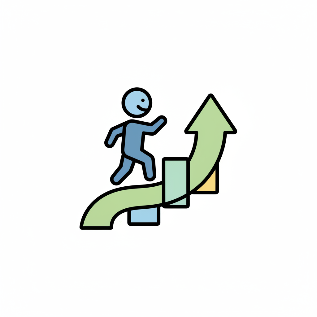 Strichmännchen steigt auf einer aufwärts gerichteten Pfeil-Treppe, die Fortschritt symbolisiert.