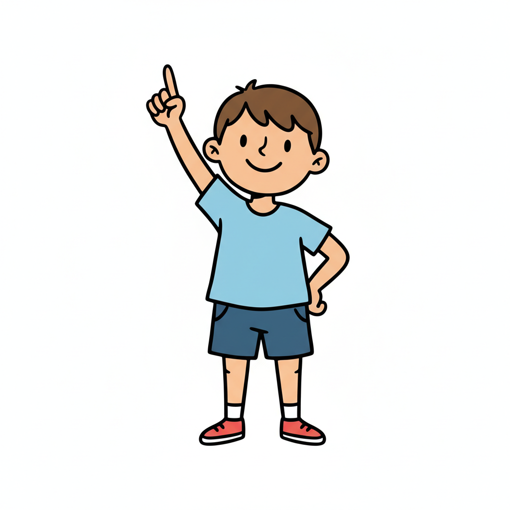 Ein fröhlicher Junge zeigt mit dem Finger nach oben.