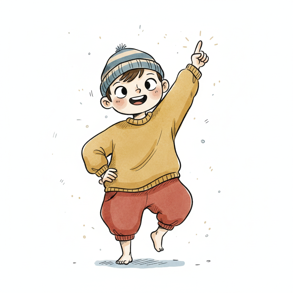 Ein fröhlicher Junge in einem Pulli und Mütze, der begeistert mit dem Finger zeigt.