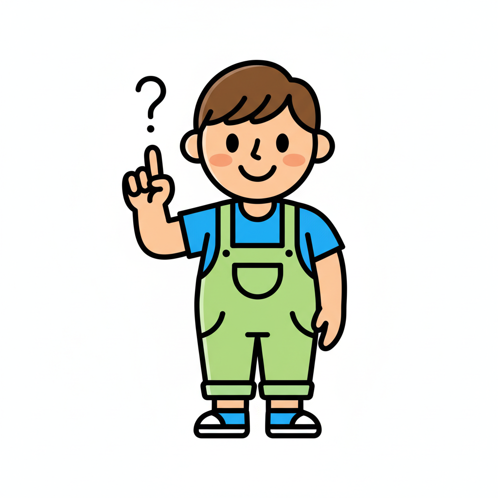 Ein fröhlicher Junge mit Fragezeichen über dem Kopf.