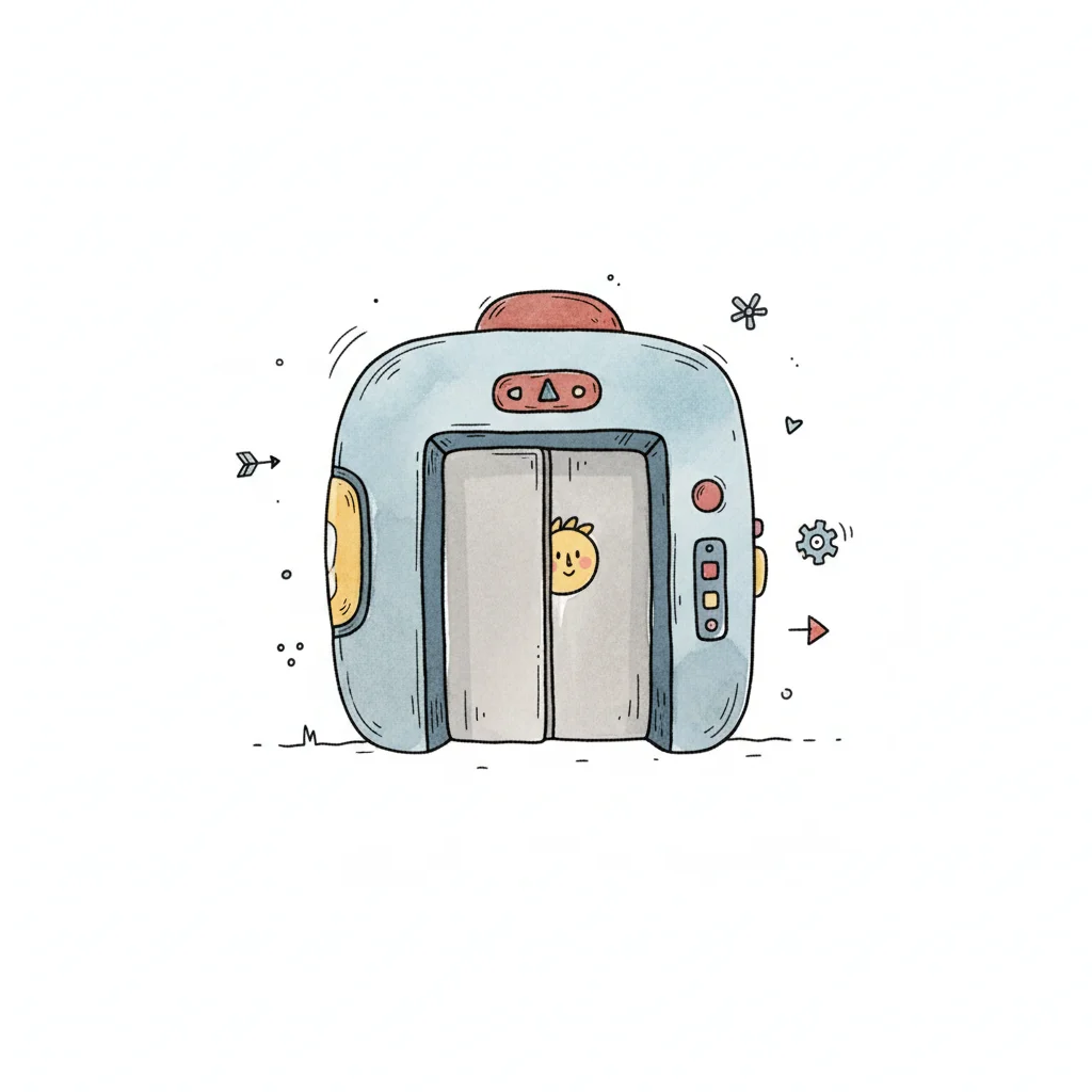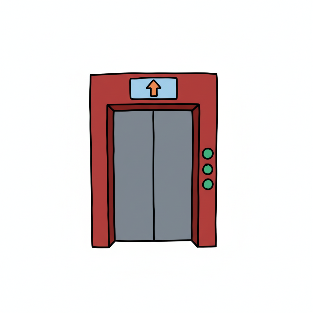 Eine rote Aufzugtür im Cartoon-Stil mit grauen Türen, einem Aufwärtspfeil und grünen Knöpfen.