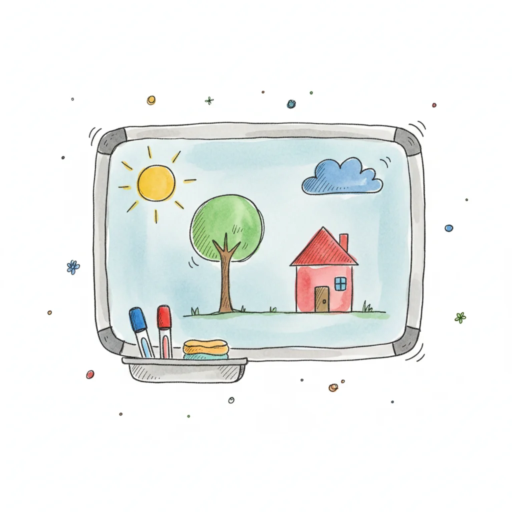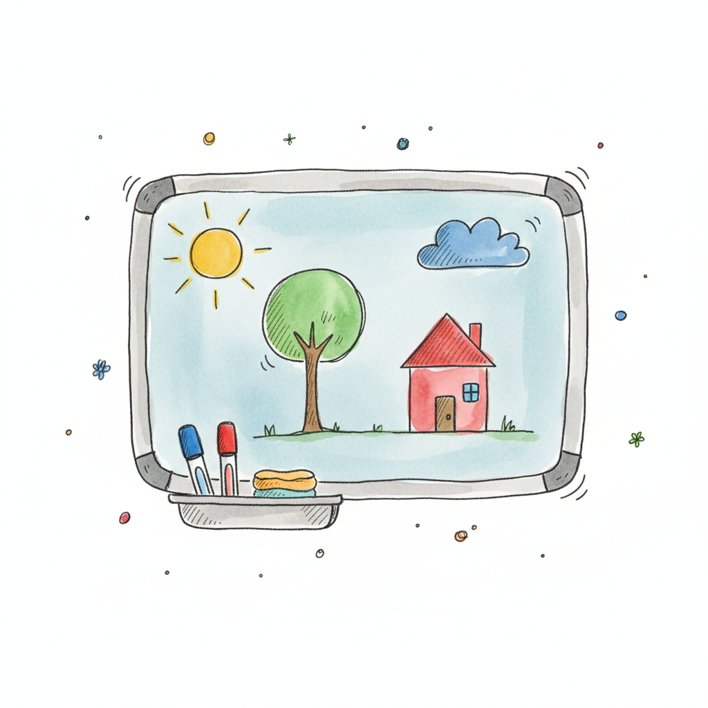 Whiteboard mit bunter Kinderzeichnung: Haus, Baum, Sonne, Wolke. Marker und Schwamm liegen bereit.