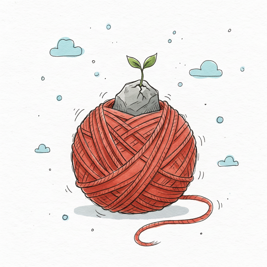 Grüner Keimling wächst aus Stein auf rotem Wollknäuel, umgeben von kleinen Wolken.