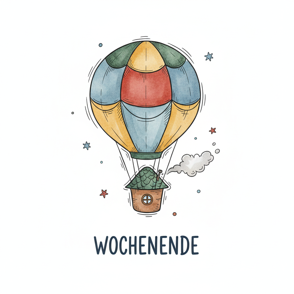 Bunter Heißluftballon mit Haus als Korb und "WOCHENENDE" Schriftzug, umgeben von Sternen.