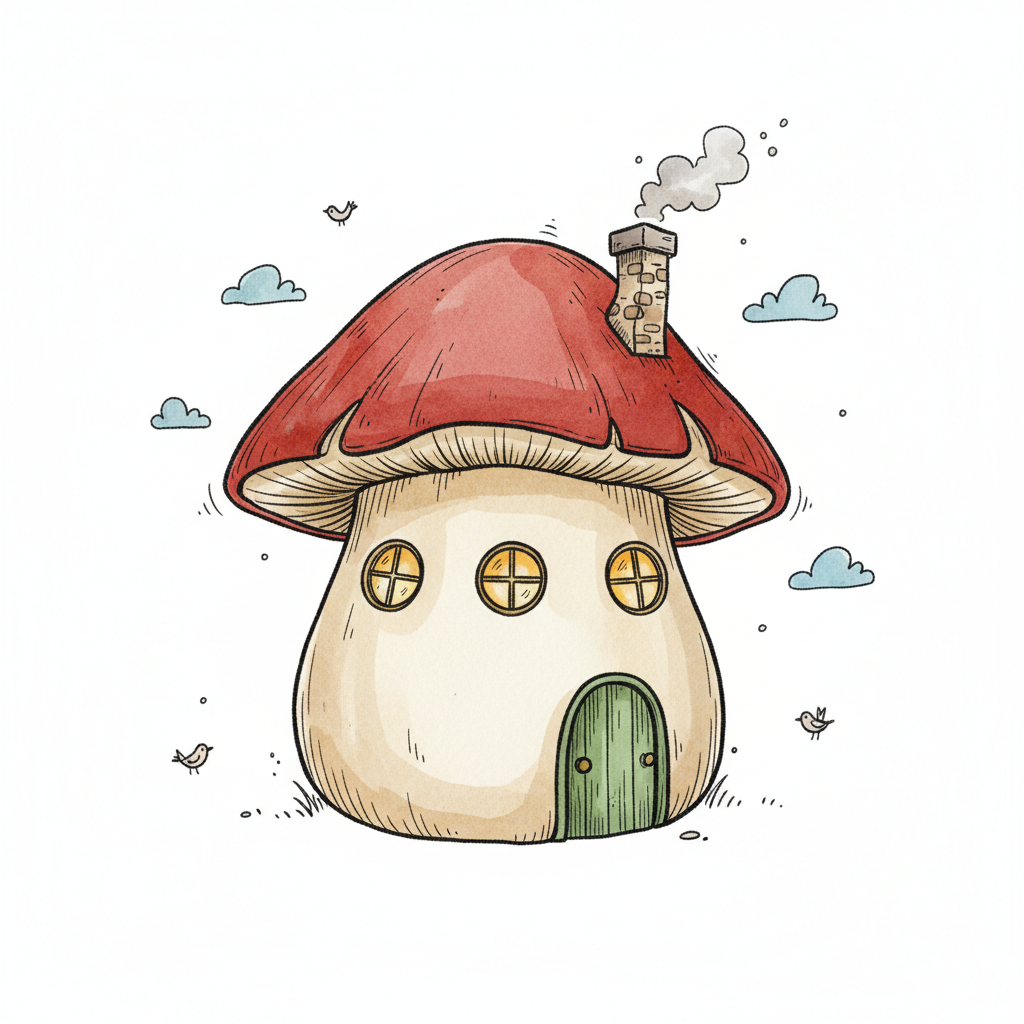 Niedliches Pilzhaus mit rotem Dach, Schornstein, Fenstern und Tür, umgeben von Vögeln und Wolken.