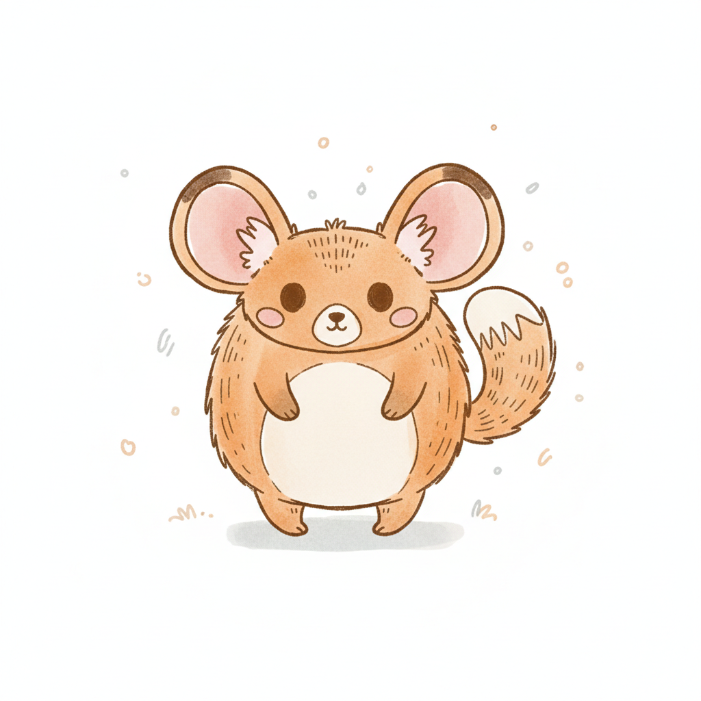 Niedliche, flauschige Cartoon-Maus mit großen Ohren und buschigem Schwanz im Aquarell-Stil.