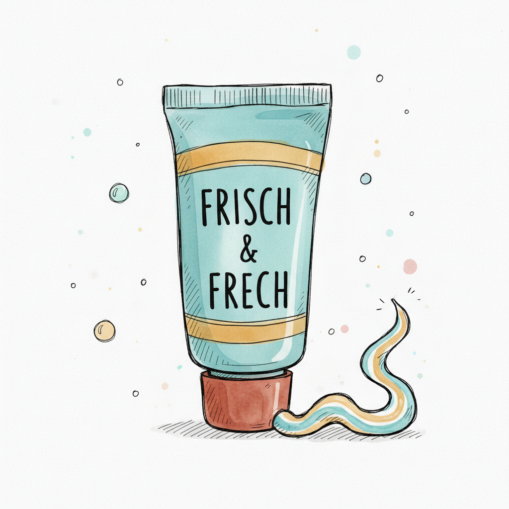 Bunte Aquarell-Illustration einer Tube 'FRISCH & FRECH' mit herausgedrückter, gestreifter Paste.