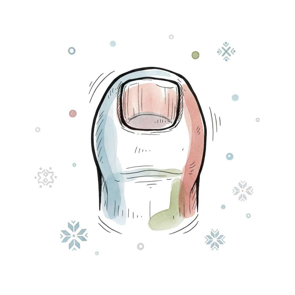 Kalt aussehende Zehe mit Farbschattierungen und Schneeflocken im Aquarellstil.
