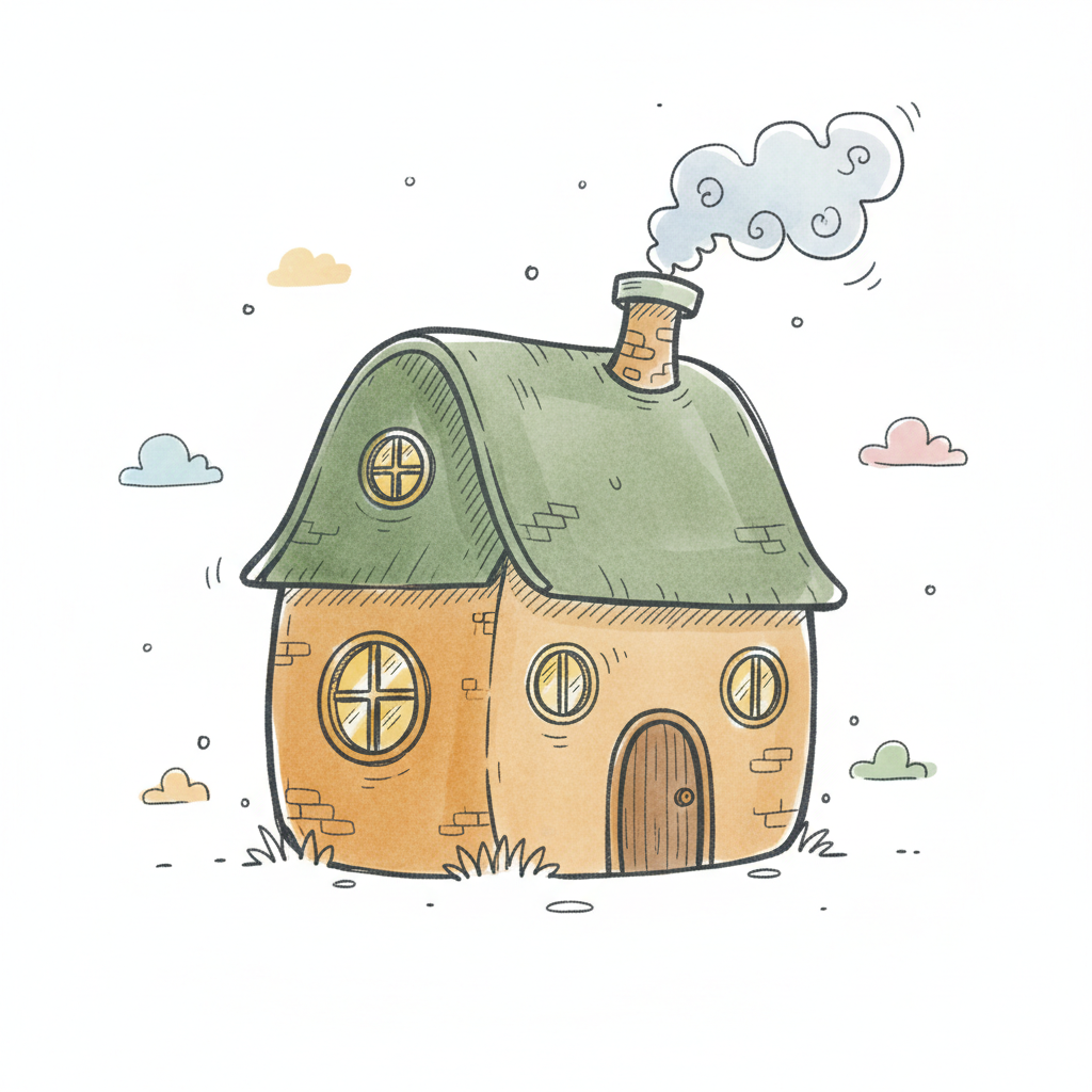 Niedliches, gezeichnetes Haus mit grünem Dach, rauchendem Schornstein und runden Fenstern.