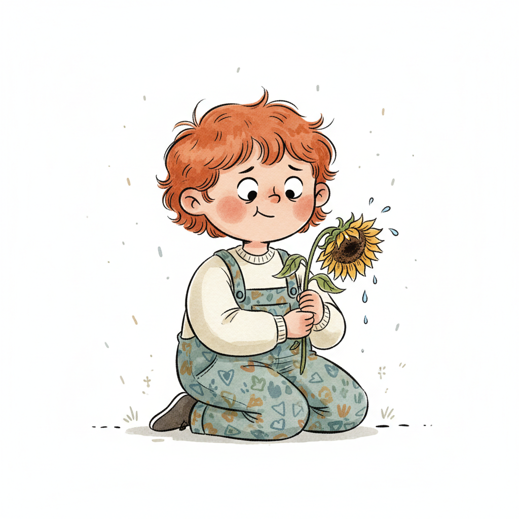 Ein rothaariges Kind kniet und hält eine welkende Sonnenblume, aus der Wasser tropft.