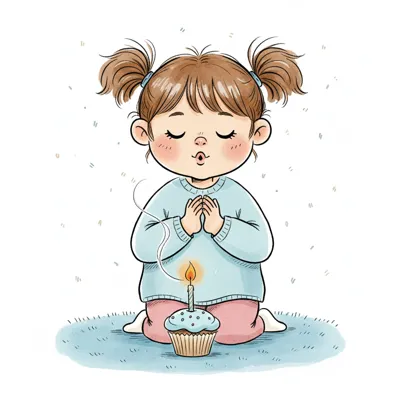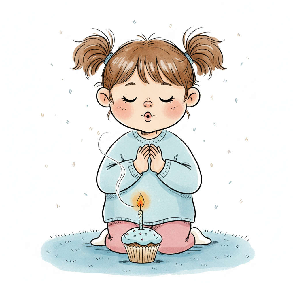 Niedliches Mädchen bläst eine Kerze auf einem Cupcake aus und macht einen Wunsch.
