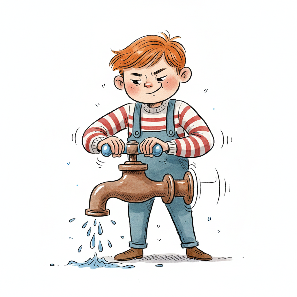 Mürrischer Junge dreht fest an einem großen Wasserhahn, aus dem Wasser tropft.