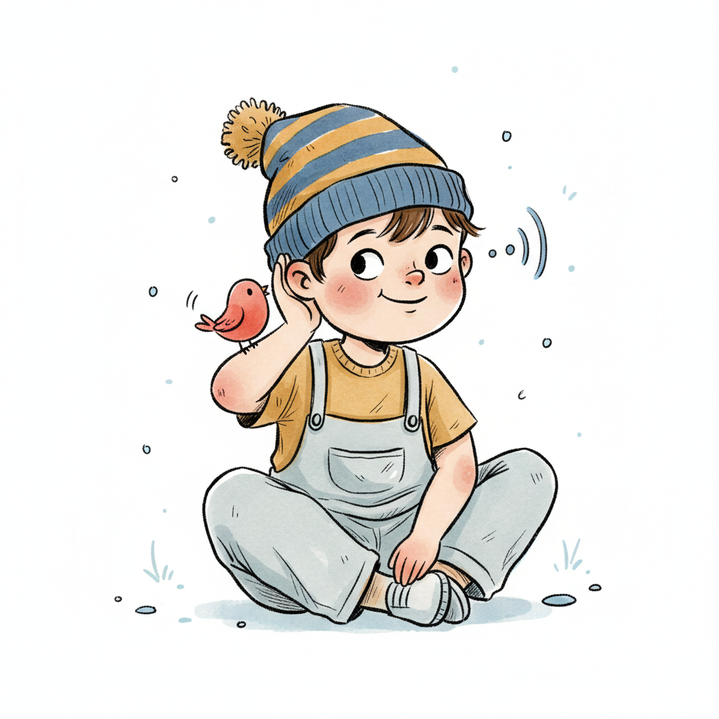 Ein lächelndes Kind mit Mütze und Latzhose lauscht einem Vogel auf seiner Schulter.