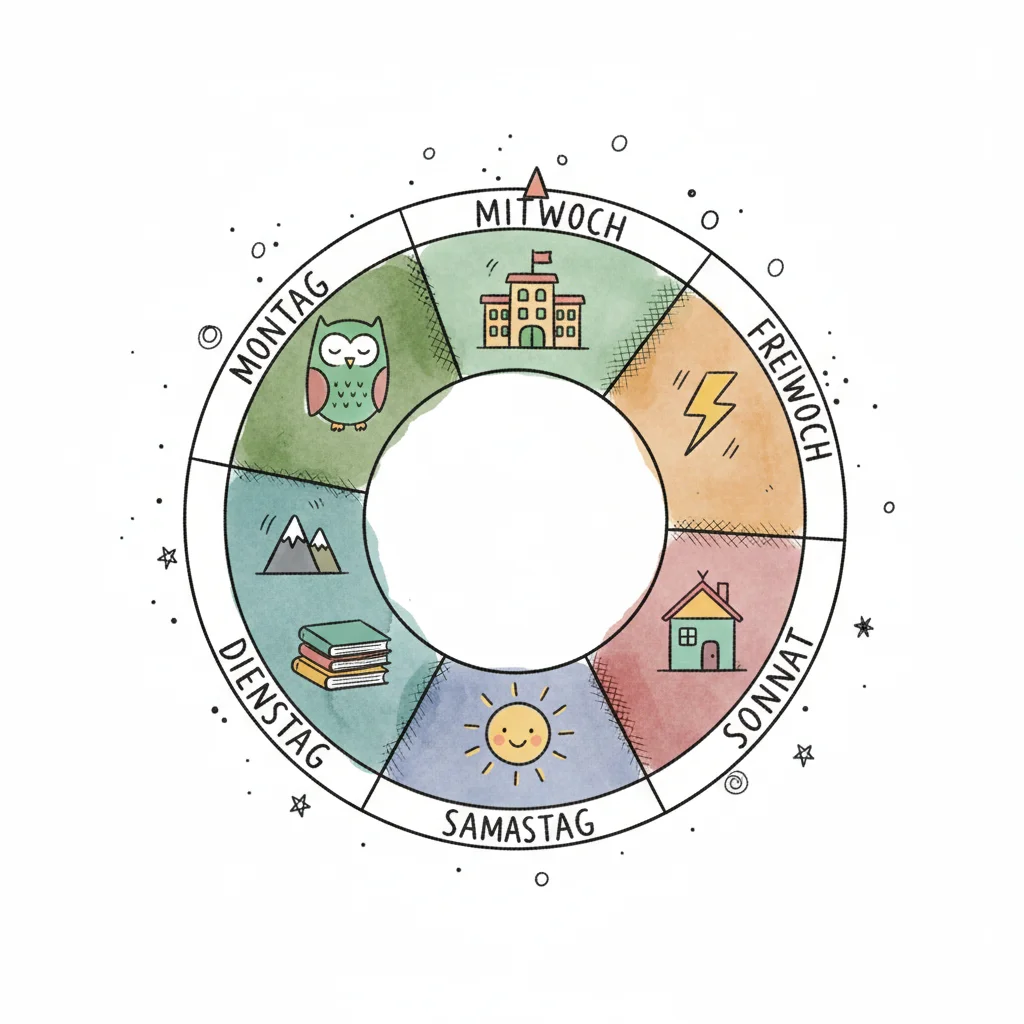 Ein Wochenplan-Rad mit Tagen und passenden Symbolen wie Eule, Schule, Haus und Sonne in Aquarellstil.