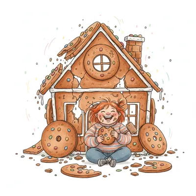 Glückliches Kind isst Kekse vor einem zerfallenden Lebkuchenhaus.