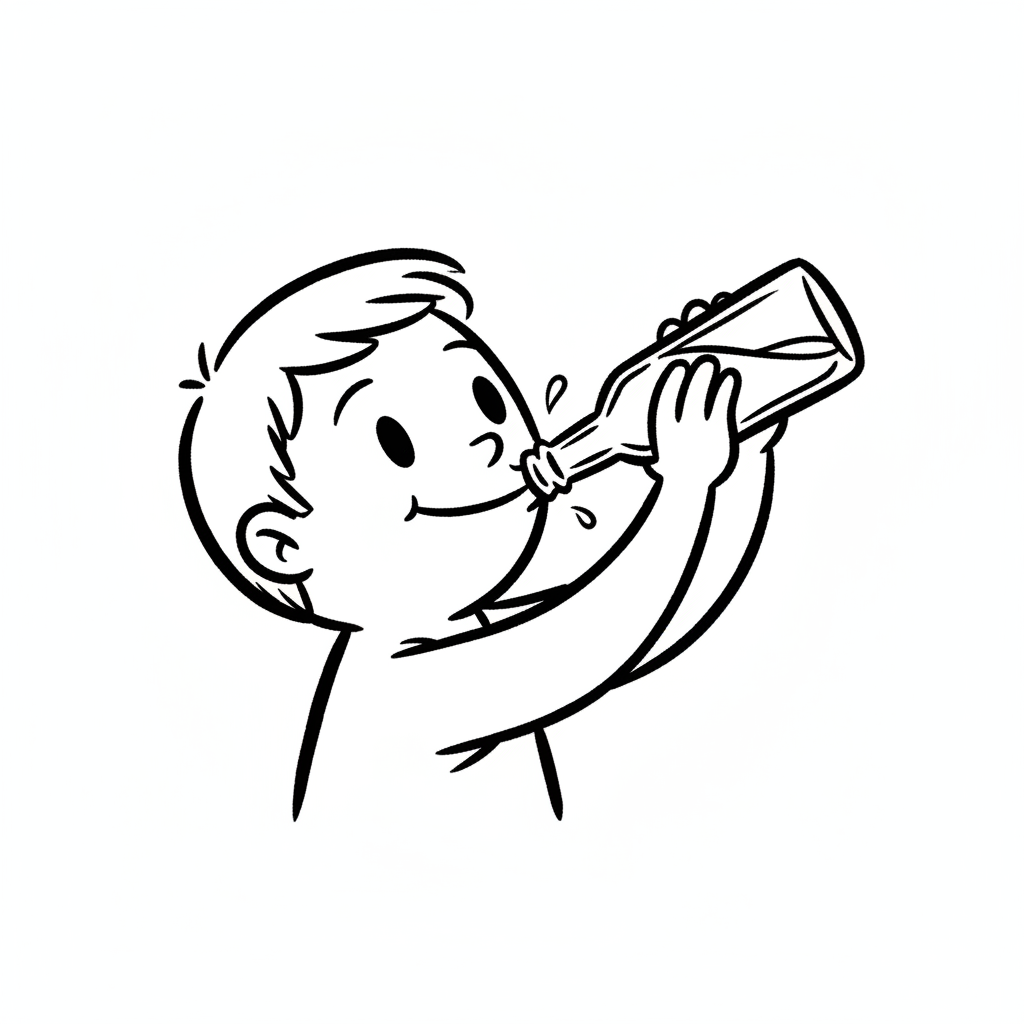 Ein Kind trinkt aus einer Flasche und schaut nach oben.