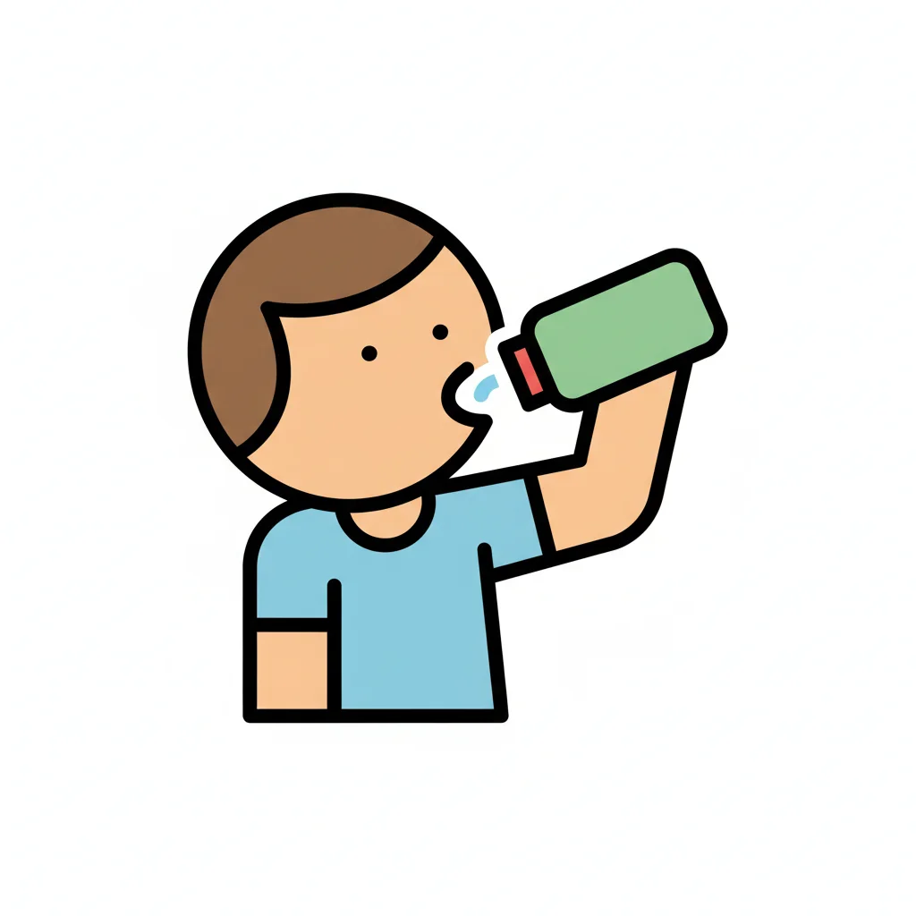 Ein Junge trinkt fröhlich aus einer Flasche Wasser.