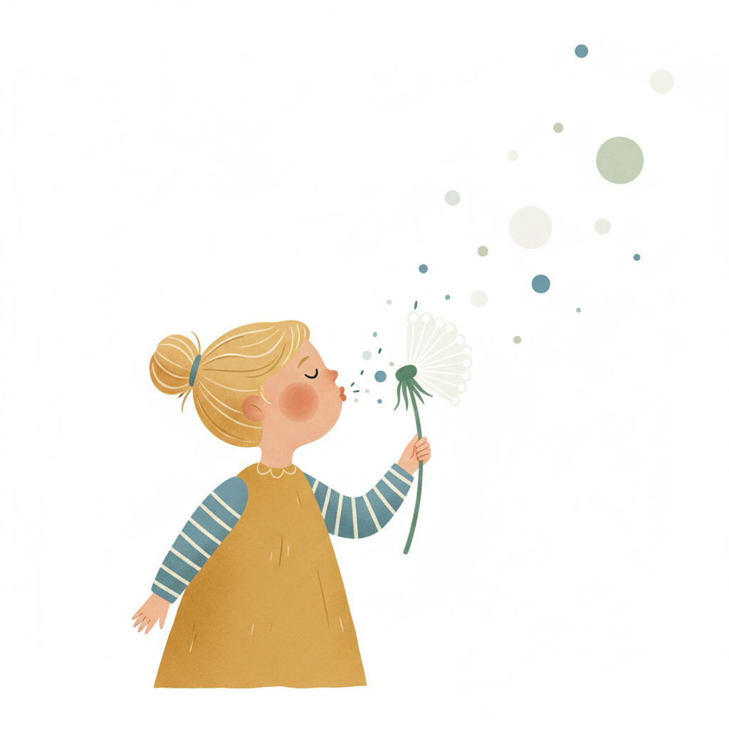 Niedliches Mädchen bläst auf eine Pusteblume, deren Samen als bunte Punkte davonfliegen.