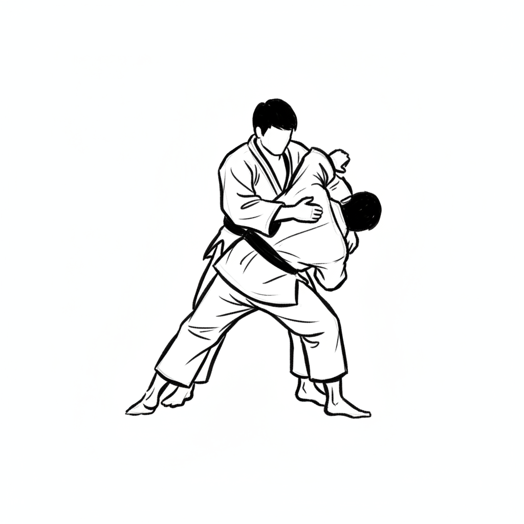 Schwarz-weiße Illustration von zwei Judoka in Kampfanzügen, die eine Wurftechnik ausführen.