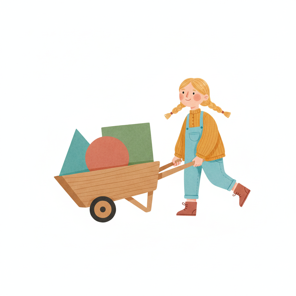 Blondes Mädchen schiebt eine Schubkarre mit bunten geometrischen Formen wie Kugel, Würfel, Dreieck.