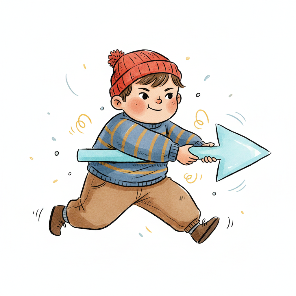 Ein Cartoon-Junge mit roter Mütze rennt fröhlich und hält einen großen blauen Pfeil.