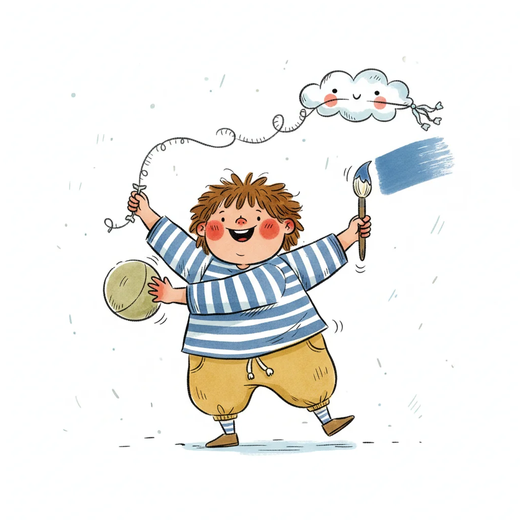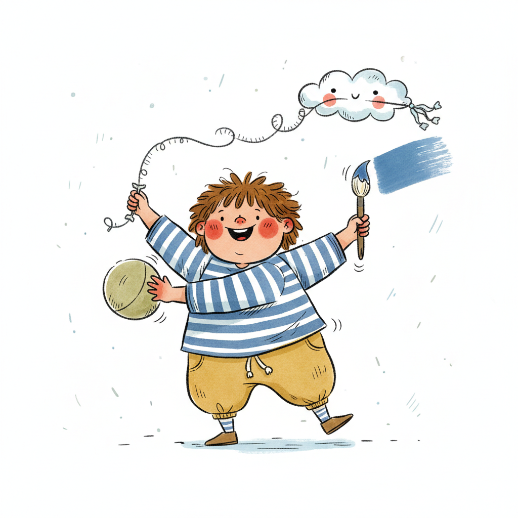 Niedliche, kindgerecht illustrierte Szene mit einem Kind oder einer Person als Hauptfigur, vor rein weißem Hintergrund, im frech-nordischen Aquarell-Skizzenstil. Klare, leicht wackelige Tuschekonturen, sichtbare Pinsel- und Strichtextur, dezente Schraffuren, weiche handgemalte Farbflächen in gedeckten Farben. Einfache, runde Formen. Keine harten Schatten, sondern sanfte, transparente Aquarellschichten. Leicht raue, handgezeichnete Linien statt glatter Vektorkanten. Subtile, vereinzelte Kritzelpunkte oder kleine Details im Hintergrund (wie Pünktchen oder feine Striche), aber keine echte Umgebung oder Landschaft. Die Figur ist mittig zentriert. Insgesamt charmant, humorvoll, warm und handgemacht wirkend. WICHTIG: Das Bild darf ABSOLUT KEINEN TEXT, KEINE BUCHSTABEN und KEINE ZAHLEN enthalten.