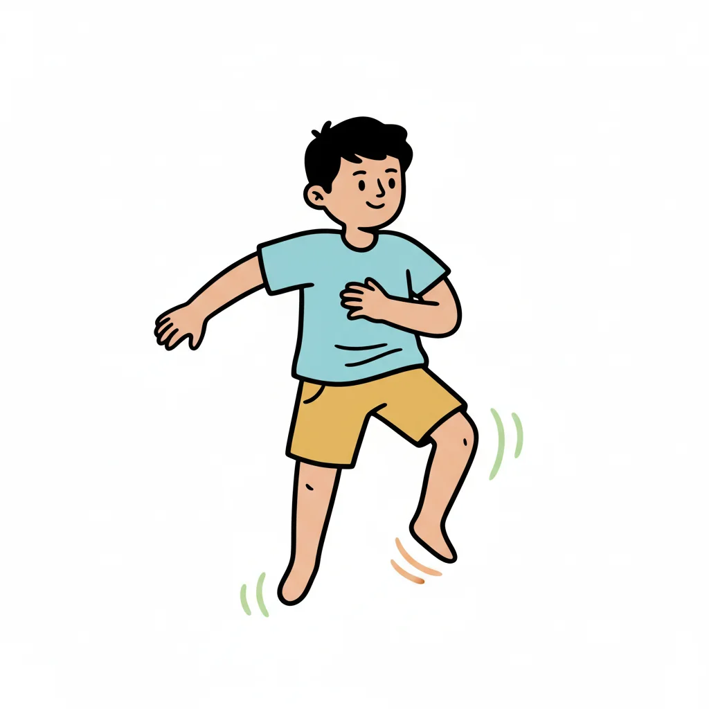 Ein lächelnder Cartoon-Junge in blauem T-Shirt und gelben Shorts springt oder tanzt barfuß.