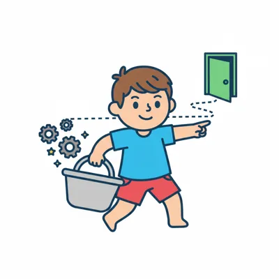 Fröhlicher Junge mit Eimer zeigt den Weg von Zahnrädern zu einer offenen Tür.