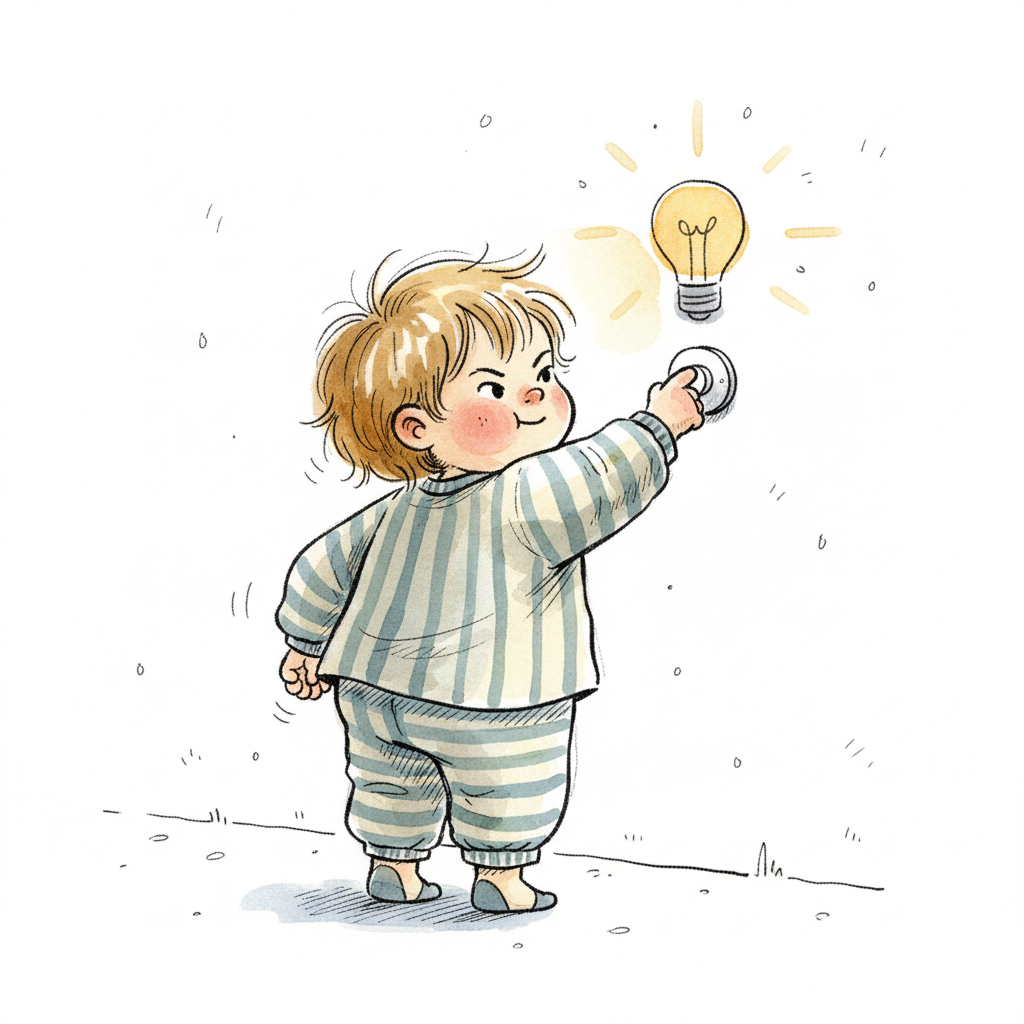 Niedliches Kind in Schlafanzug schaltet Licht an, symbolisiert eine neue Idee oder Erkenntnis.