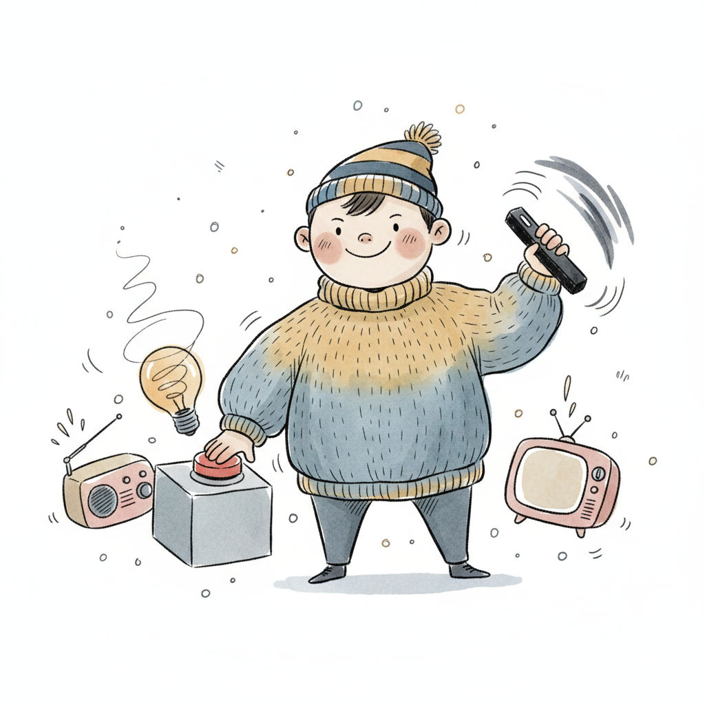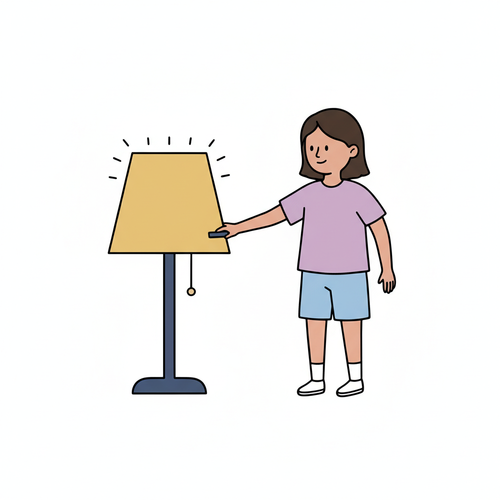Eine Figur schaltet eine Lampe ein und lächelt.