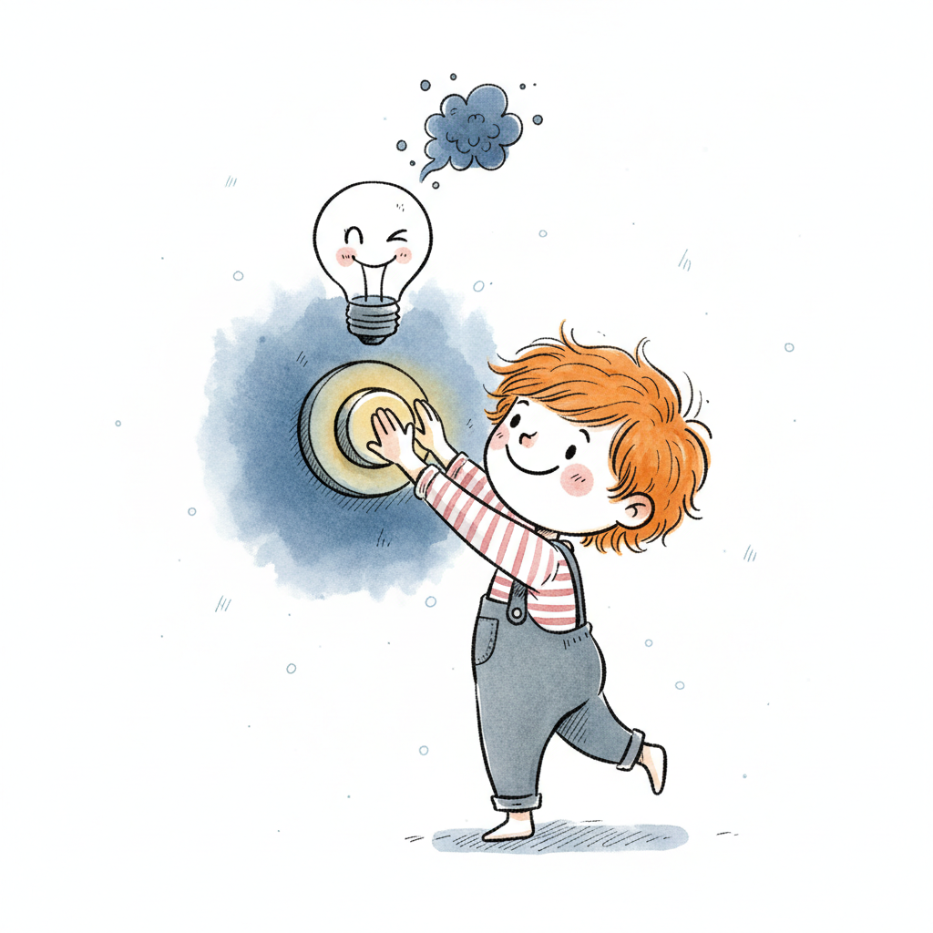 Ein Junge schaltet das Licht aus, symbolisiert durch einen Schalter mit "OFF".