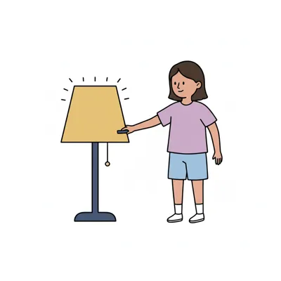 Ein Mädchen schaltet eine Stehlampe ein, die hell leuchtet.