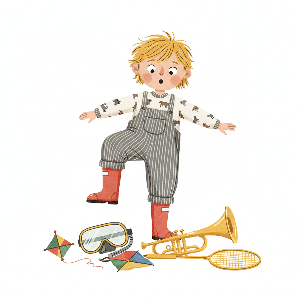 Überraschtes Kind in Latzhose und roten Stiefeln balanciert über verstreutem Spielzeug.
