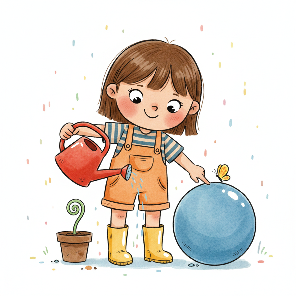 Niedliches Mädchen gießt Pflanze, während ein Schmetterling auf einer blauen Kugel sitzt.